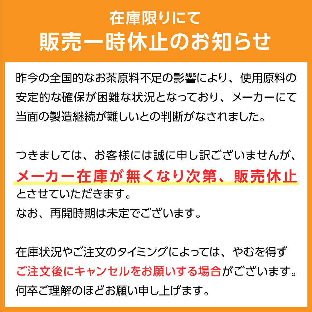 昨今の全国的なお茶原料不足の影響により、使用原料の安定的な確保が困難な状況となっております。