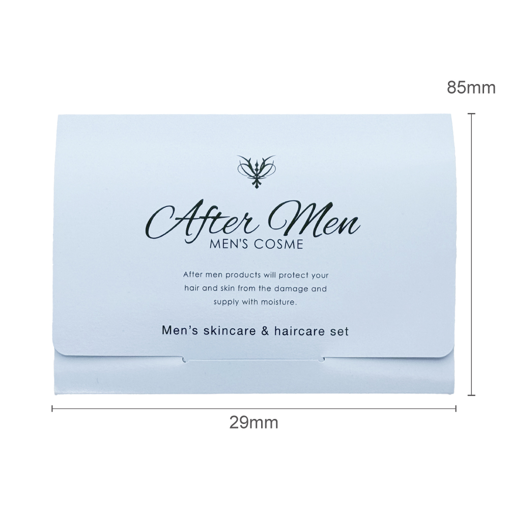クレンジングシェーブ、オールインワンジェル、ヘアトニック、ヘアリキッドワックスのメンズコスメ4点を、台紙にセットしました。