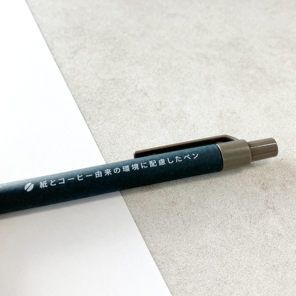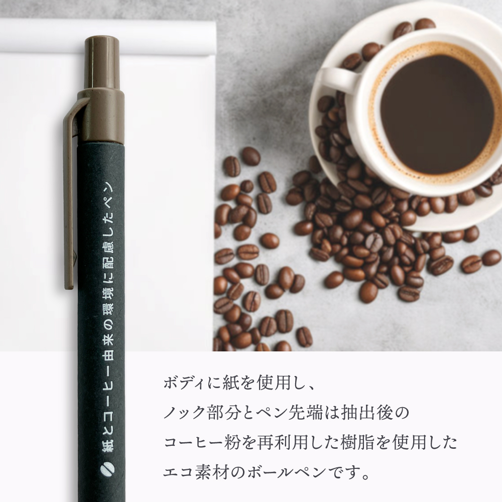 ボディに紙、ノック部分とペン先端に抽出後のコーヒー粉を再利用した樹脂を使用したエコなボールペン