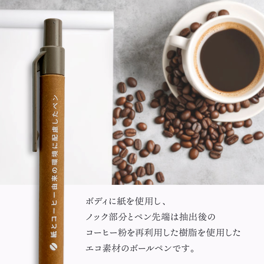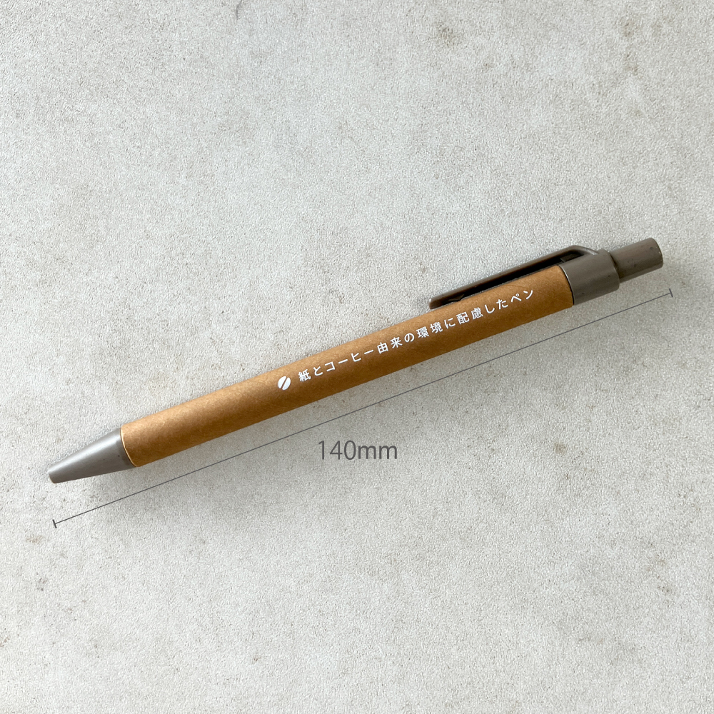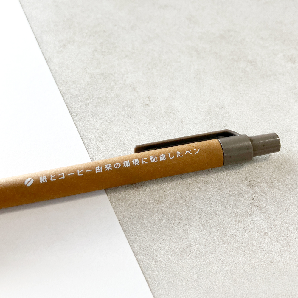 本体ボディ部分は紙、ノック部分とペン先端には抽出後のコーヒー粉を再利用して練りこんだ樹脂を使用しています。